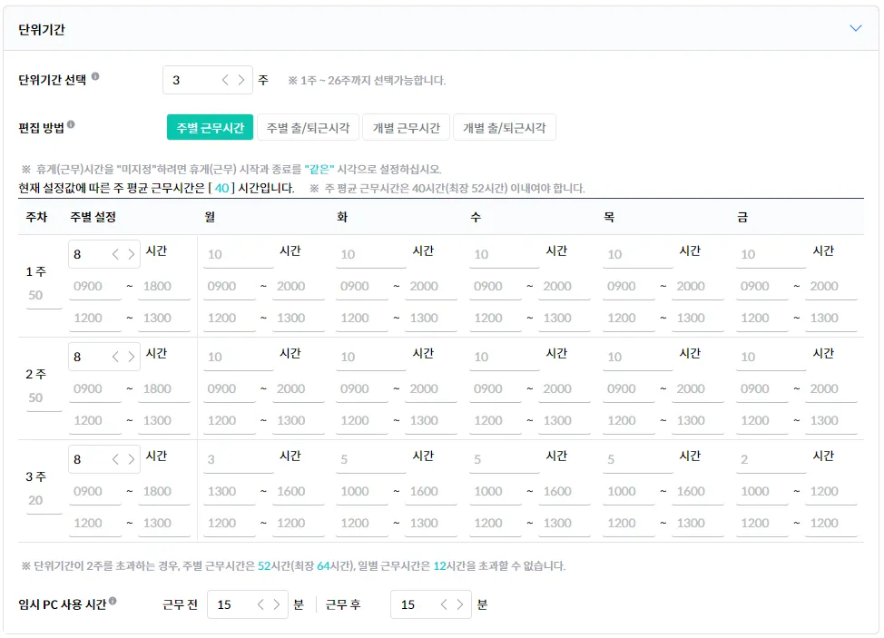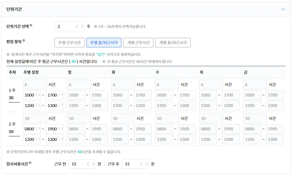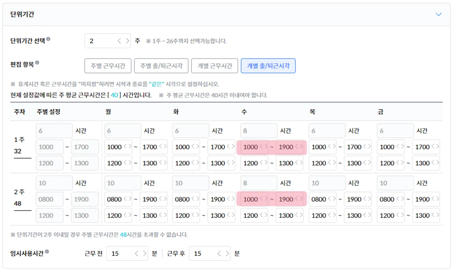 ⇒ 근무시간과 휴게시간을 일별로 다르게 설정할 수 있습니다.
