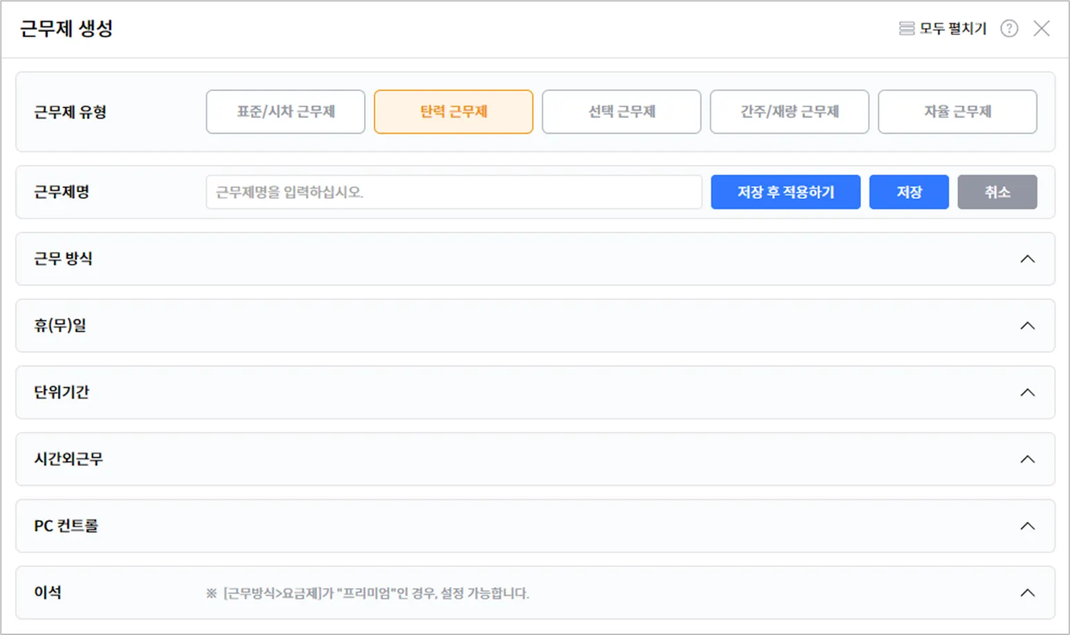 저장 : 생성한 근무제를 저장합니다. 생성한 근무제는 근무제 관리 목록에 추가됩니다.