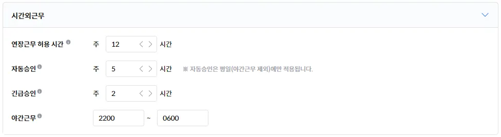 연장근무 허용시간: 주 평균 연장근무 허용시간을 입력합니다.