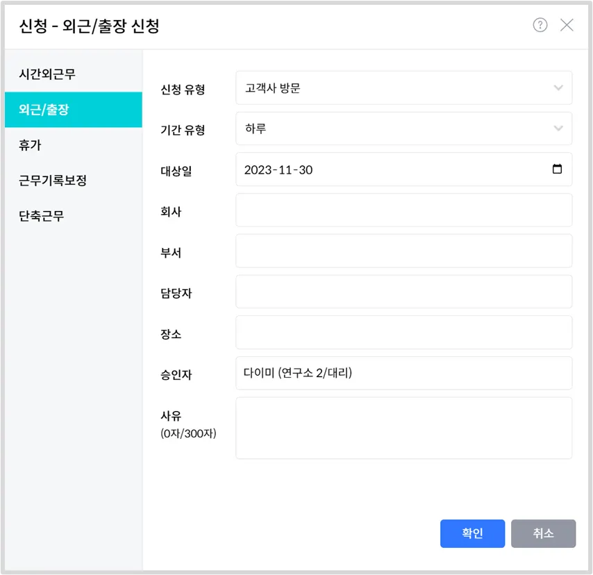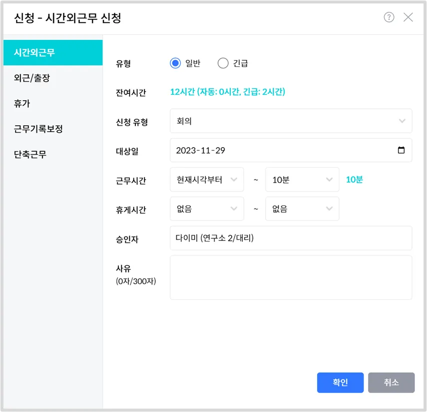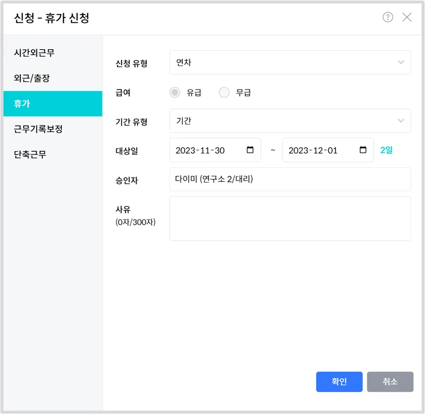 신청 유형, 급여 사항, 기간, 대상일, 승인자, 사유를 입력한뒤 확인을 눌러주세요.