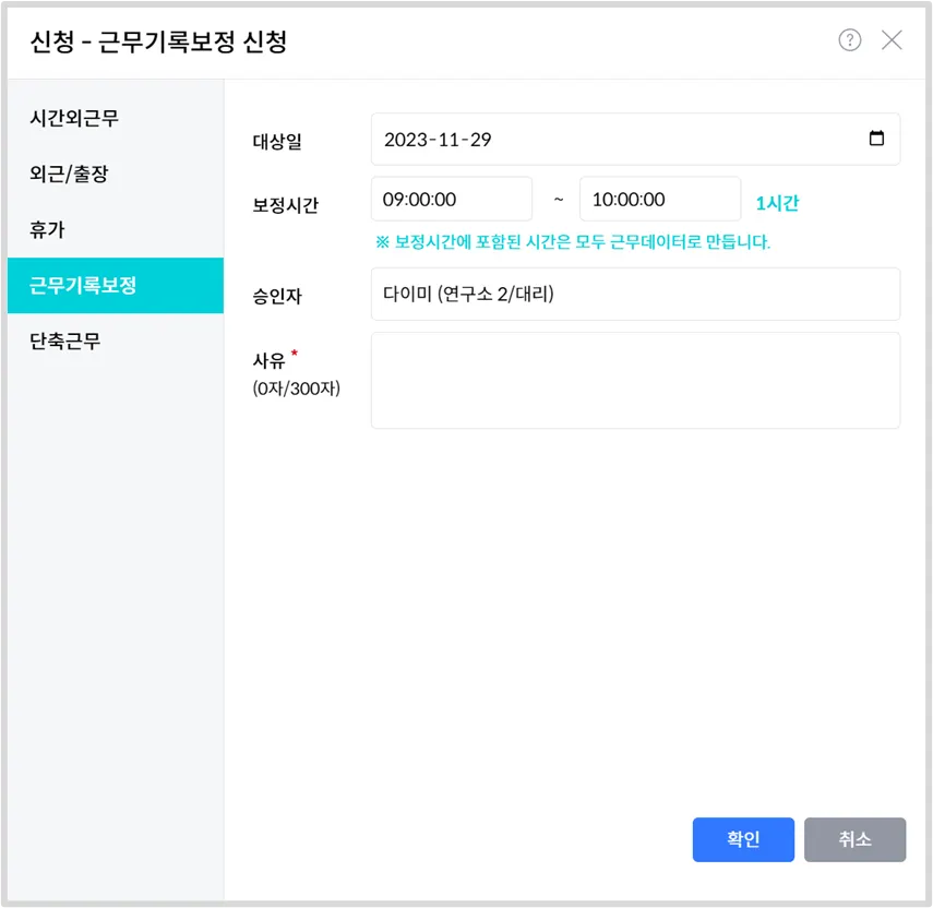 대상일 및 보정시간을 설정하여 근무기록 보정을 신청할 수 있습니다.