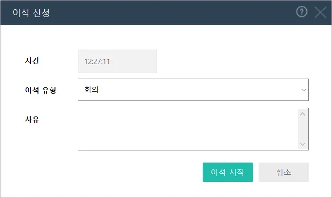 시간 및 이석 유형, 사유를 입력 후 이석을 신청할 수 있습니다.