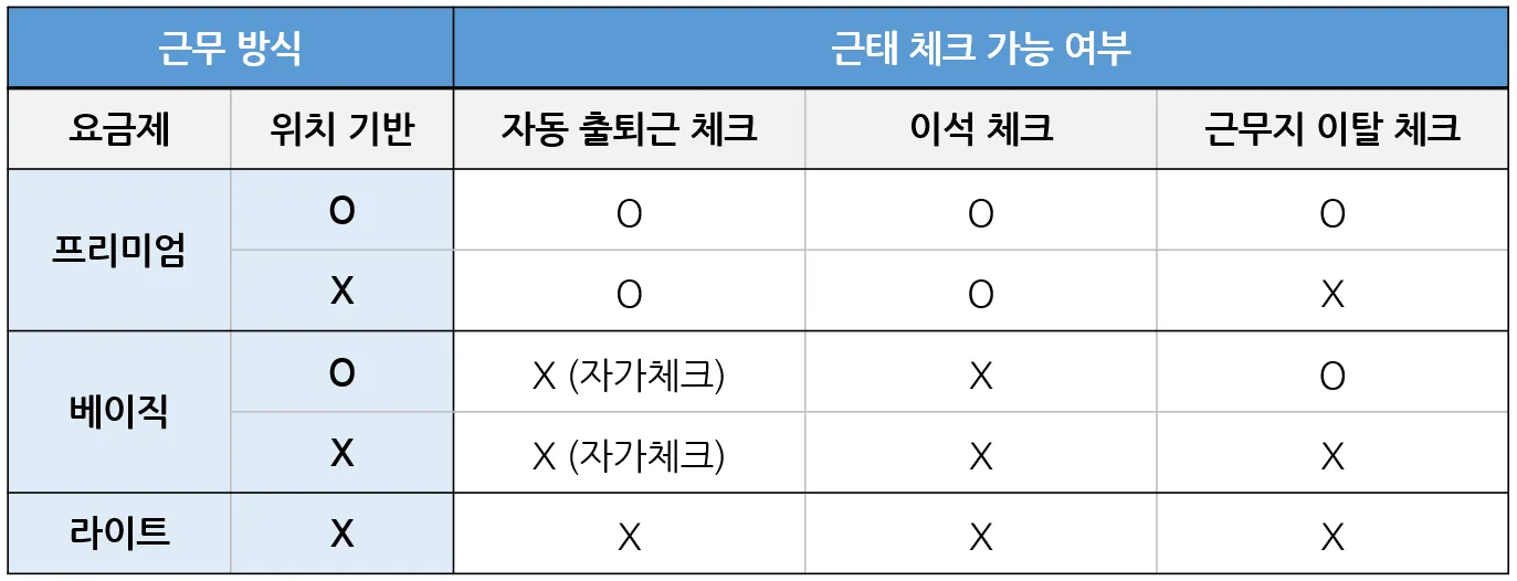 세 가지 방식의 근무관리 요금제를 제공하며 모든 기록은 실시간으로 근무 캘린더에 등록됩니다.