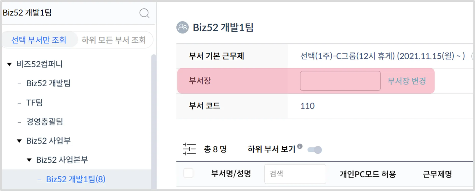 부서장이란? : 부서장으로 설정된 부서 구성원의 근무 요청에 대한 승인 및 통계 조회가 가능합니다.