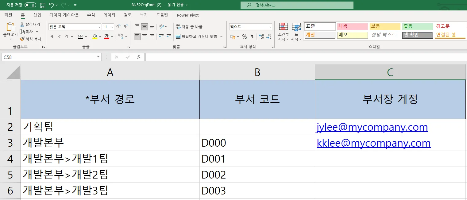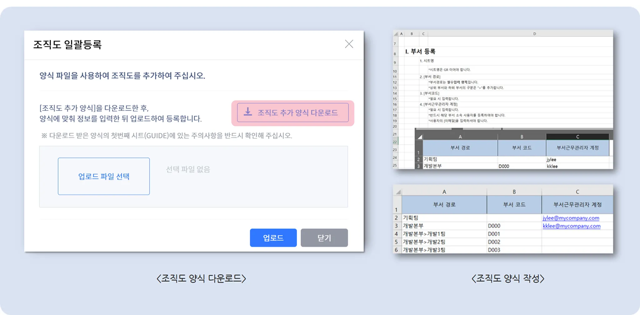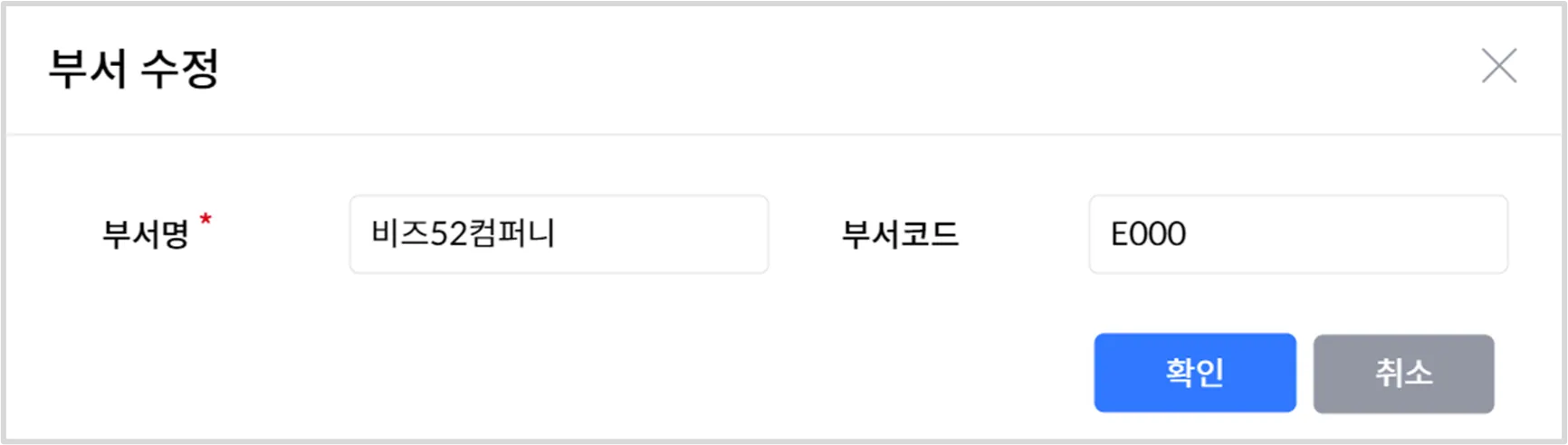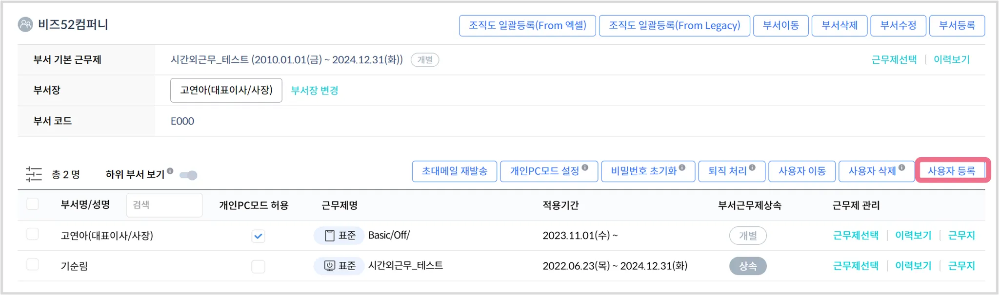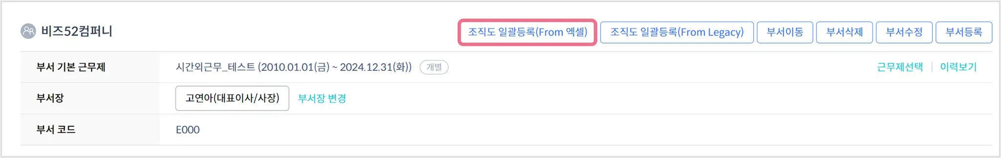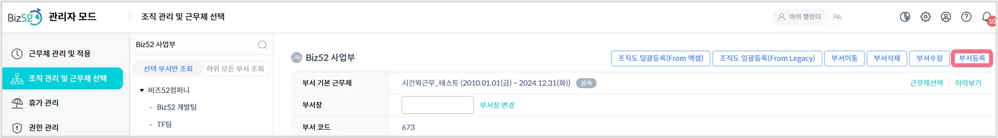 부서 역시 엑셀로 일괄 등록하는 방법 외에 한 부서씩 개별 등록 가능합니다.