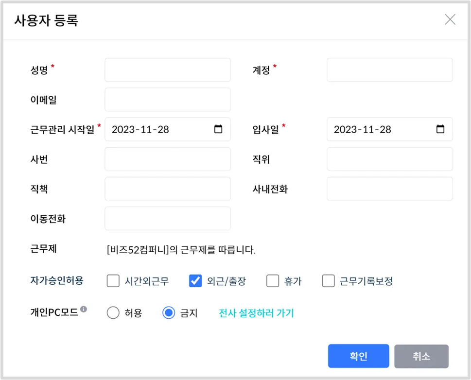 3) 이미 비즈52에 등록된 구성원을 재 입력하는 경우(* 회원 가입시 등록된 구성원)