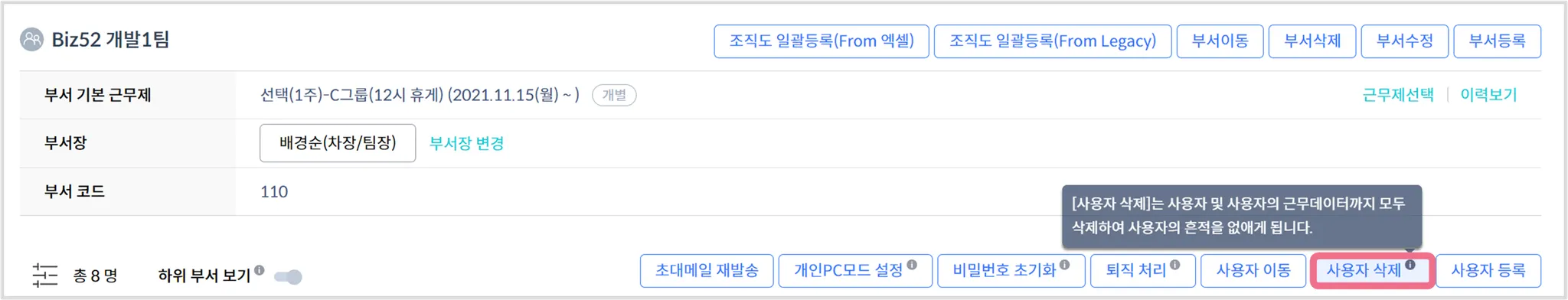 사용자 삭제를 하면 그동안 사용자의 근무 데이터까지 모두 삭제됩니다. 만약, 사용자가 퇴사하여 계정을 지우고 싶으나 근무 데이터는 보관하고 싶다면 퇴직처리를 사용하시기 바랍니다.