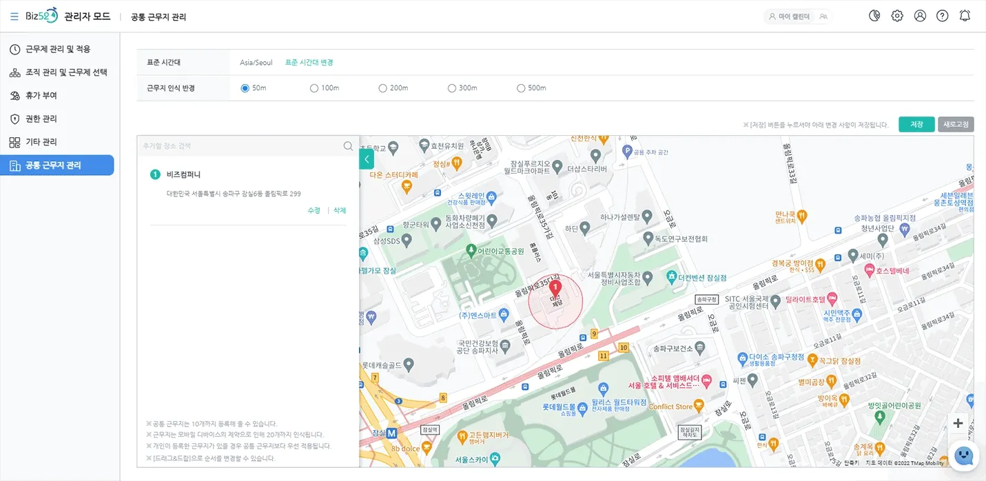 관리자 모드 - 공통 근무지 관리 - 표준 시간대 변경