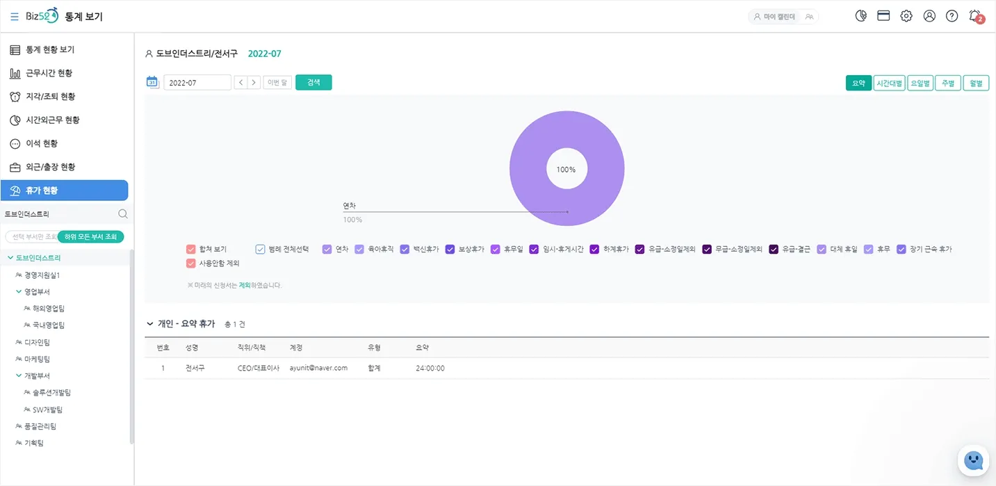 시간외 근무 현황 요약을 통해 어떤 이유로 시간외 근무를 신청하고 근무 했는지 한눈에 알수 있죠.