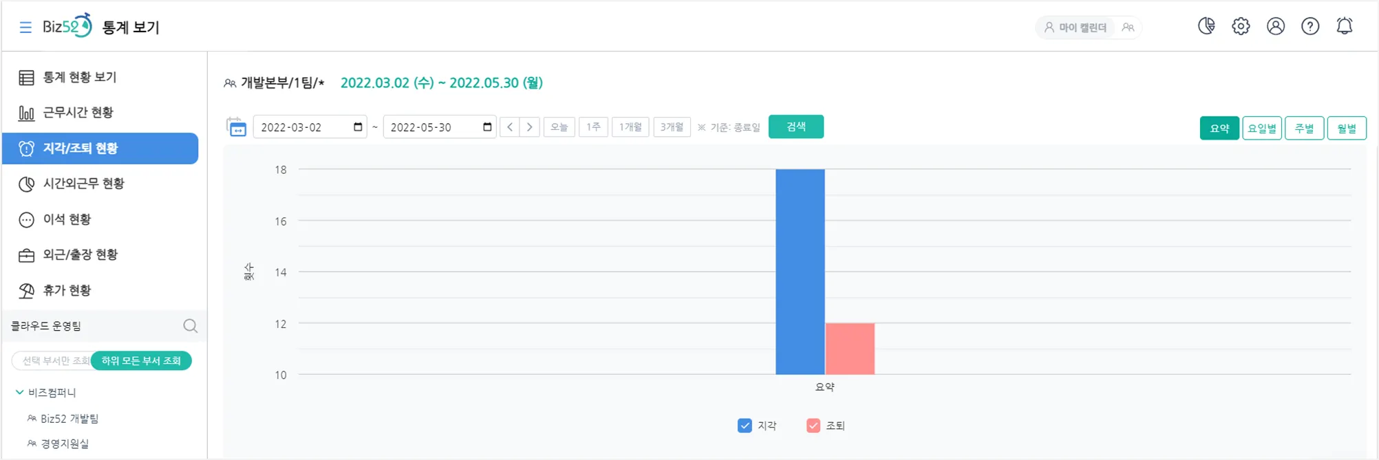 궁금할 때는 캘린더 - 통계보기의 지각/조퇴 현황에서 원하는 부서, 원하는 기간을 선택해 한번에 요약해서 확인 할 수있습니다.