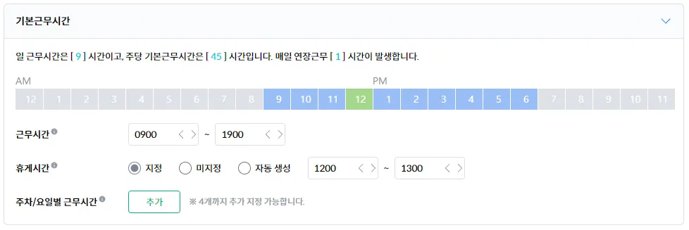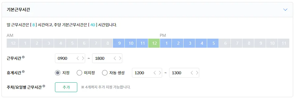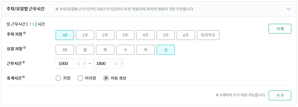 주차/요일별 근무시간: 우리 회사 근무방식에 맞는 주별, 요일별 맞춤 설정이 4개까지 가능합니다. 추가 설정이 기본근무시간보다 우선 적용되며, 마지막 추가 설정을 가장 우선합니다.