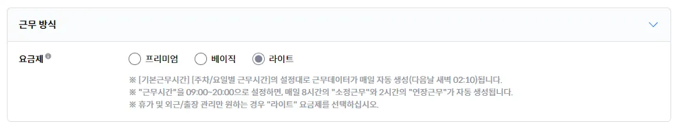 간주근무제는 근무 데이터가 자동으로 생성되며, 라이트 요금제로 고정됩니다.