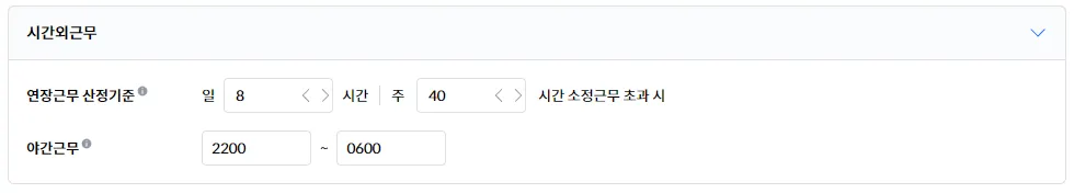야간근무: 야간근무 시간대를 입력합니다. 야간근무는 오후 10시부터 오전6시까지이며 해당 시간에 근무할 경우 가산임금이 지급됩니다.