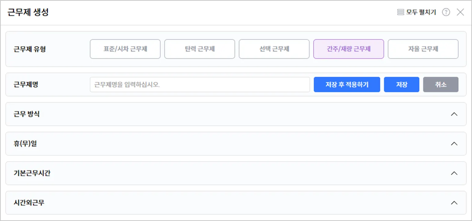 저장 : 생성한 근무제를 저장합니다. 생성한 근무제는 근무제 관리 목록에 추가됩니다.