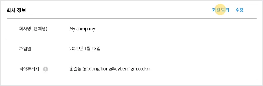 회원 탈퇴는 계약 관리자만 진행하시면 됩니다. 계약 해지 다음날부터 회원 탈퇴가 가능하다는 점 꼭 참고해주세요!