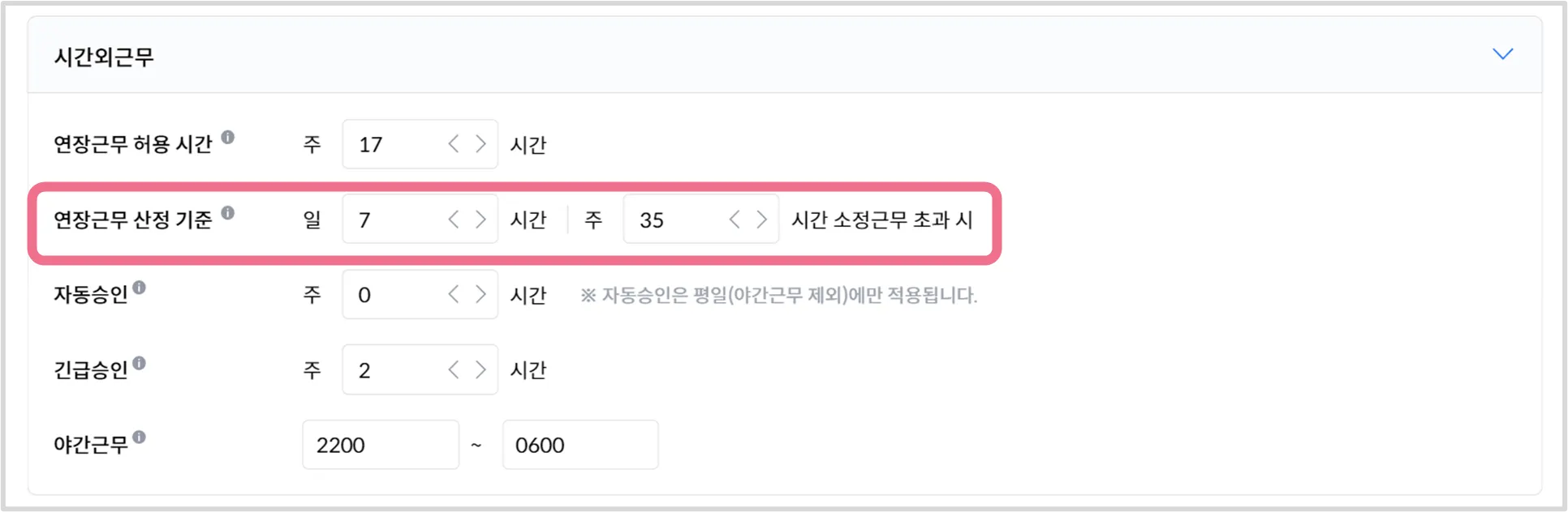 Case2) 하루 7시간 근무, 주 35시간으로 근무제 설정, 산정 기준을 일 8시간, 주 40시간 초과 시로 설정