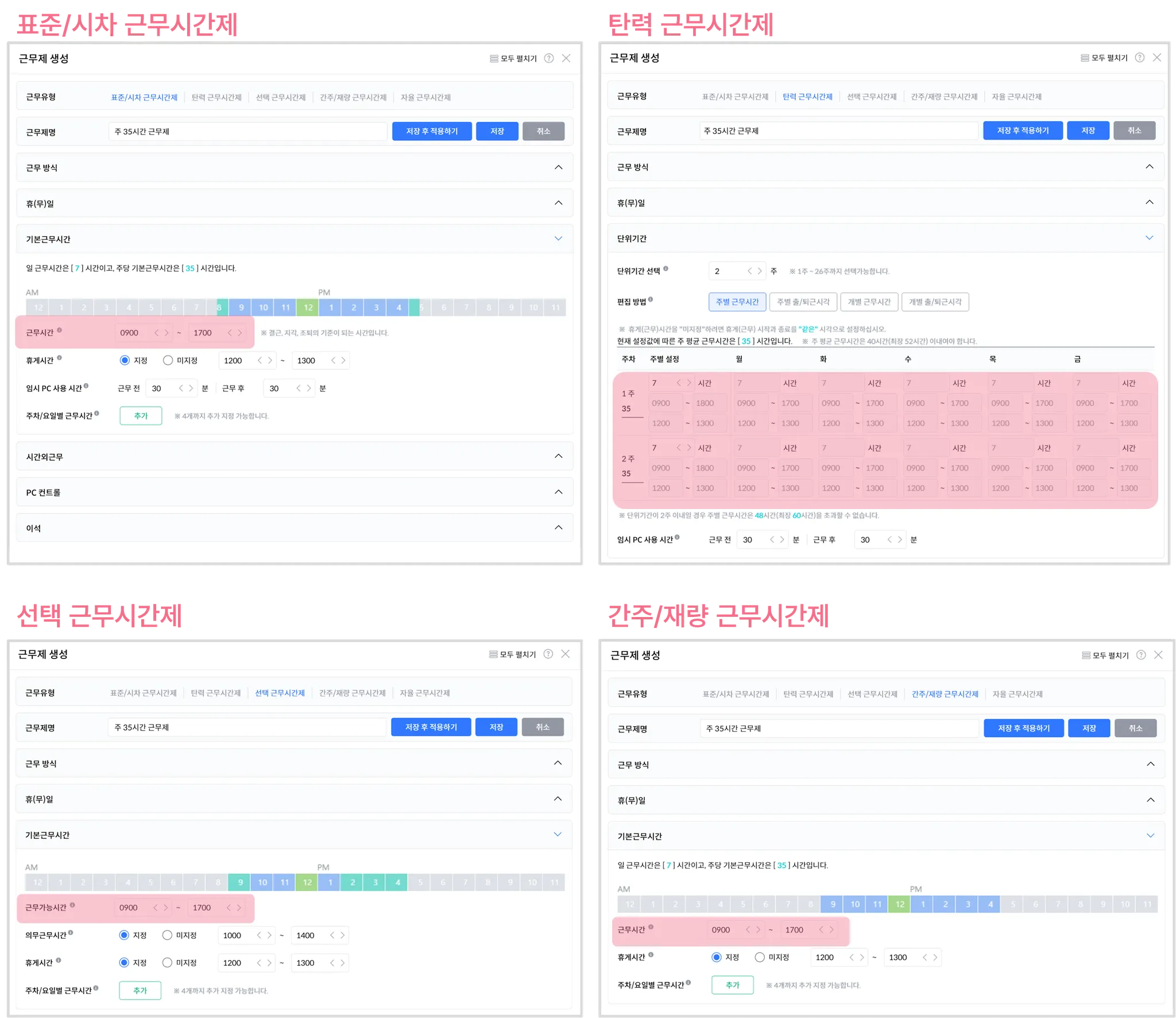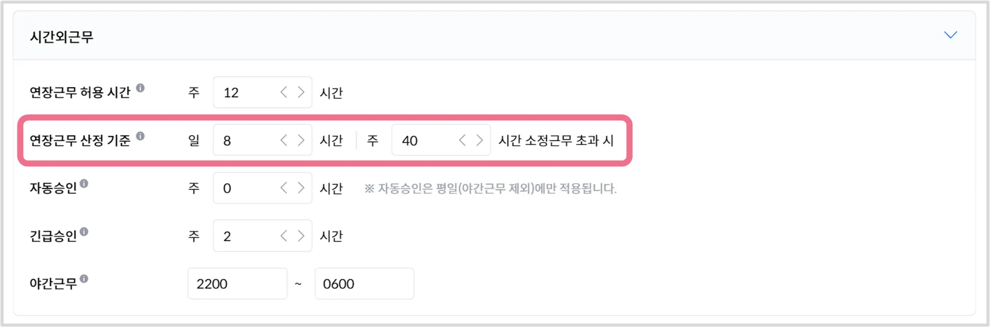 가능합니다. 근무제 설정 시 근무시간을 설정하고, 내부 규정에 맞춰 연장 근무 산정 기준을 설정하면 됩니다.