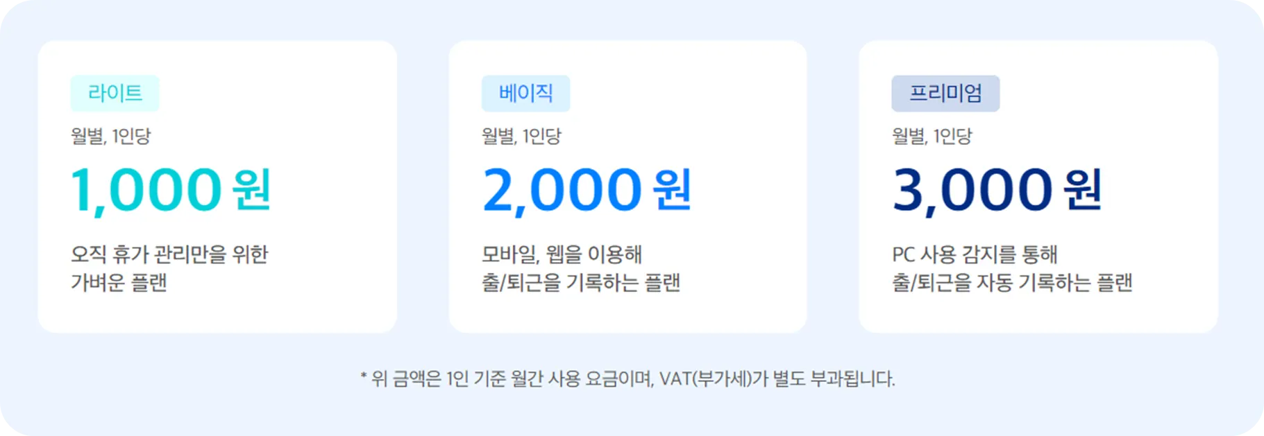출퇴근 기록 없이, 각종 휴가 관리가 가능한 라이트 요금제 사용자 1,000원(1인/월)