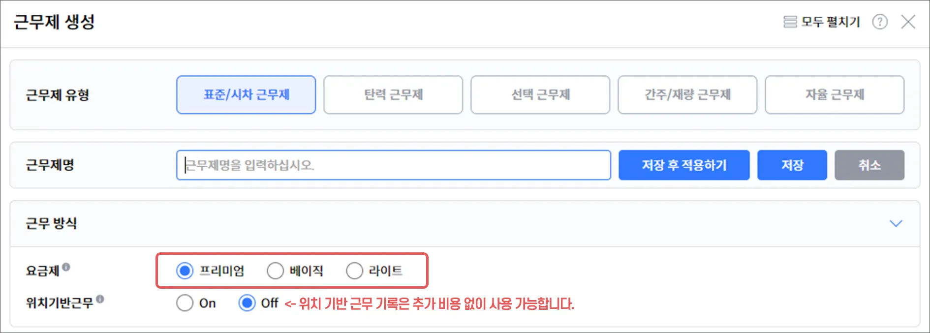 근무제 생성에서 설정 가능합니다. 관리자 모드 > 근무제 관리 및 적용 > 근무제 생성 으로 가면 아래와 같은 창이 나옵니다.