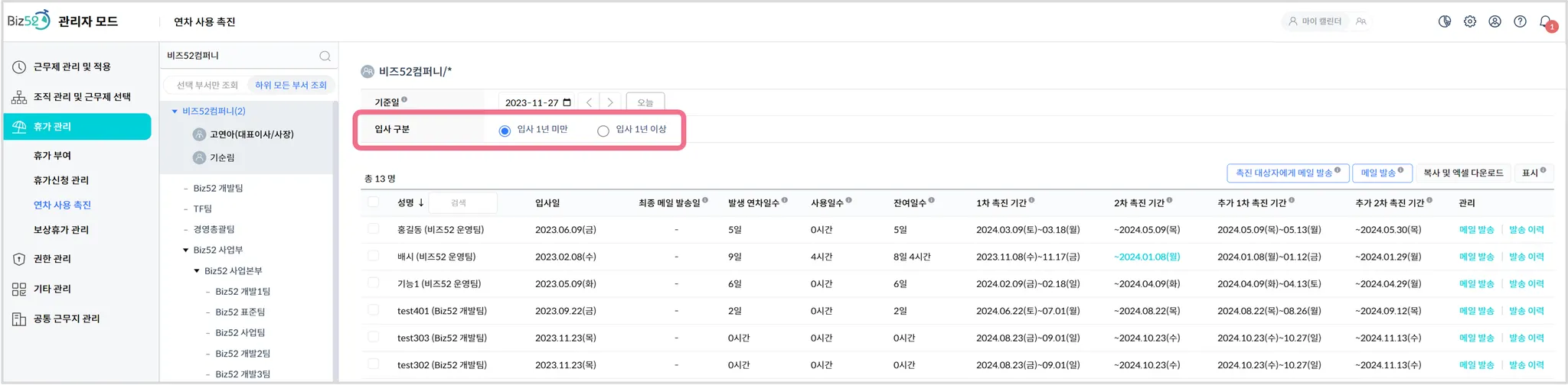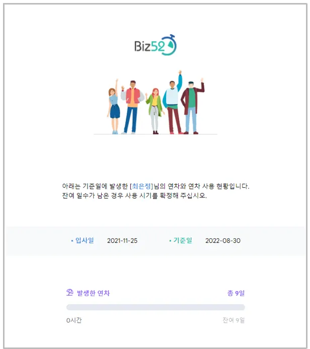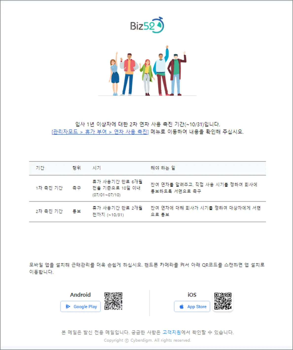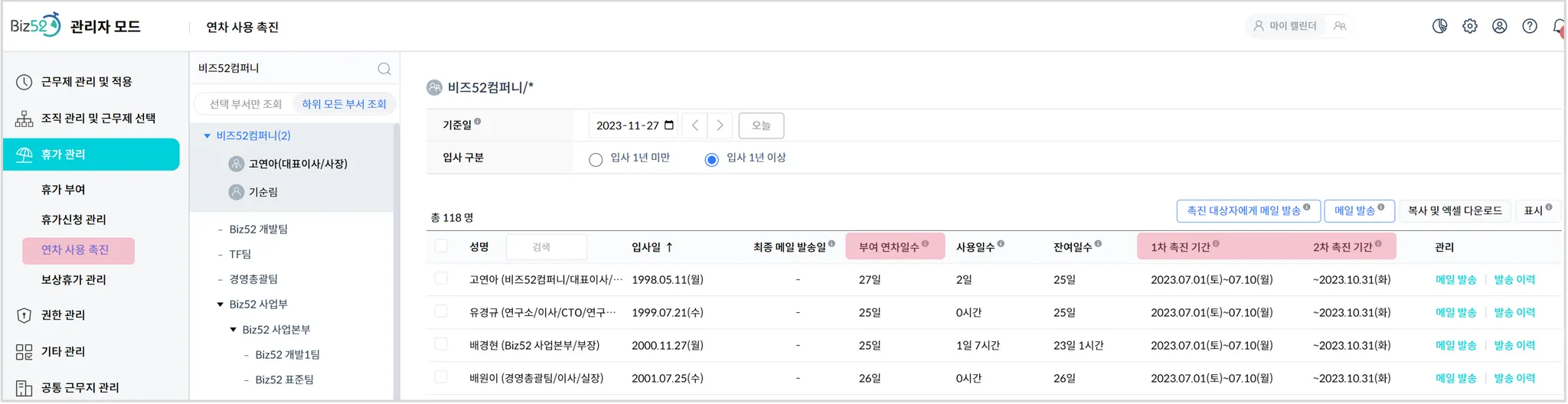 연차 촉진 메일 발송 기간이 되면, Biz52에서 시스템 관리자/근무 관리자에게 연차 사용 촉진 대상자 알림 메일이 자동으로 발송