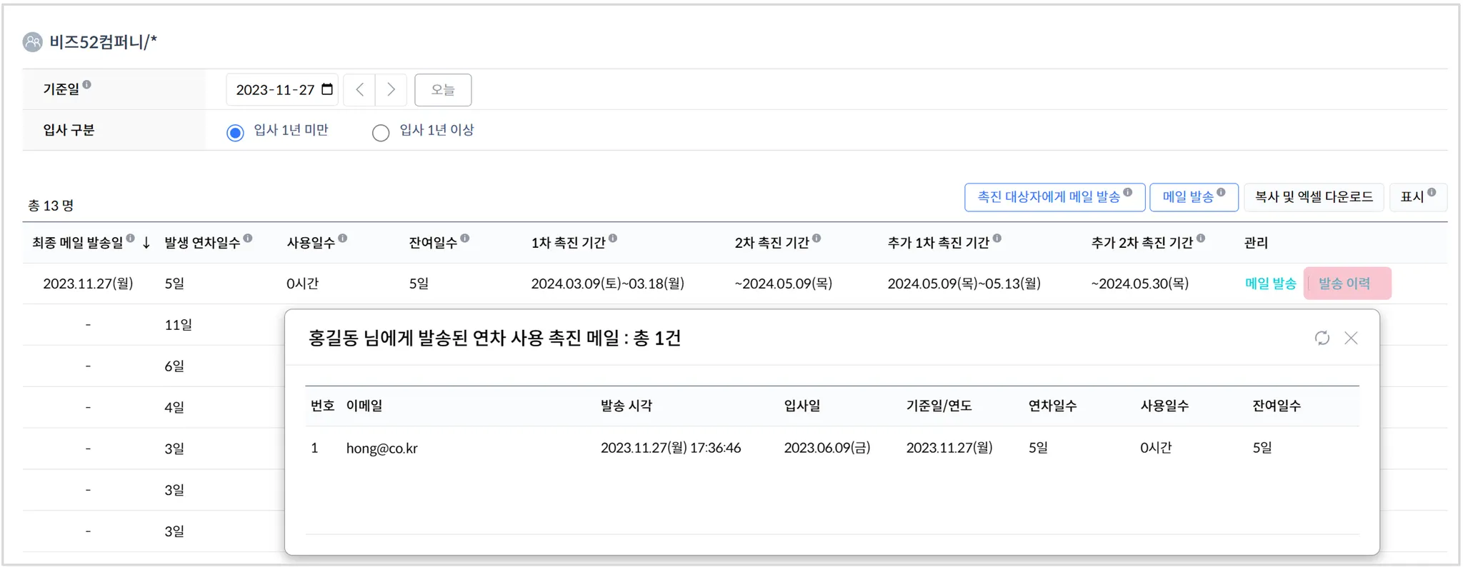 연차 사용 촉진 페이지에 1차 촉진 기간 / 2차 촉진 기간이 표시되고 있어, 연차 촉진이 필요한 대상자에게 메일을 발송할 수 있습니다.