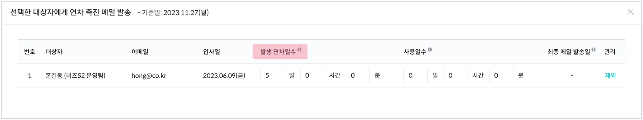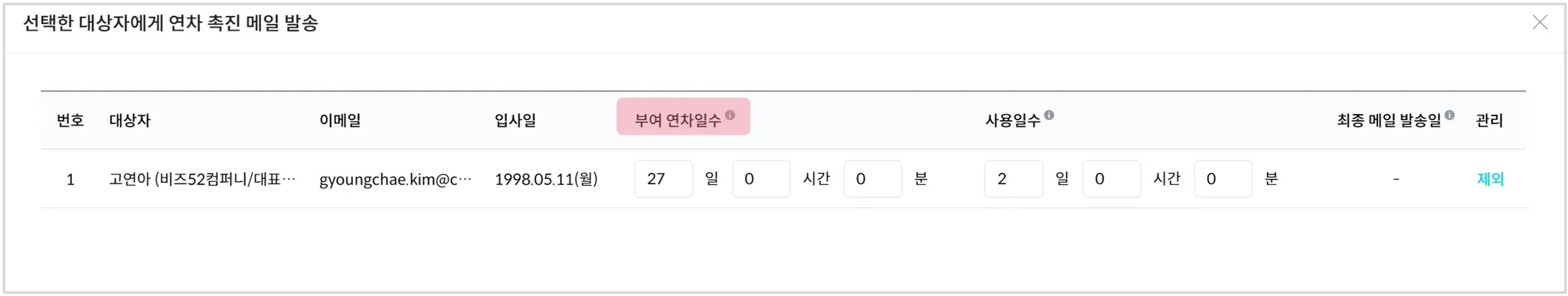촉진 대상자에게 메일 발송 버튼 클릭 시, 해당 기간에 해당하는 연차 촉진 대상자와 연차 일수를 확인할 수 있는 팝업창이 나타납니다.