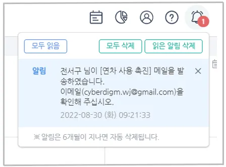 또한 사용자의 근무 캘린더 우측 상단에서 연차 사용 촉진 메일 수신 알림