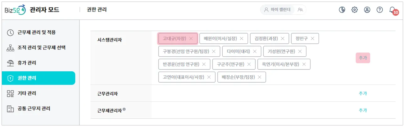 2) 기존 관리자 삭제 : 이름 옆 X 클릭