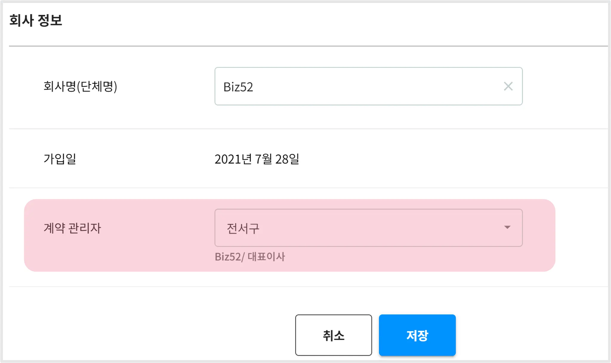 계약관리 - 관리 속 회사 정보에서 계약 관리자를 바꿀 수 있습니다.