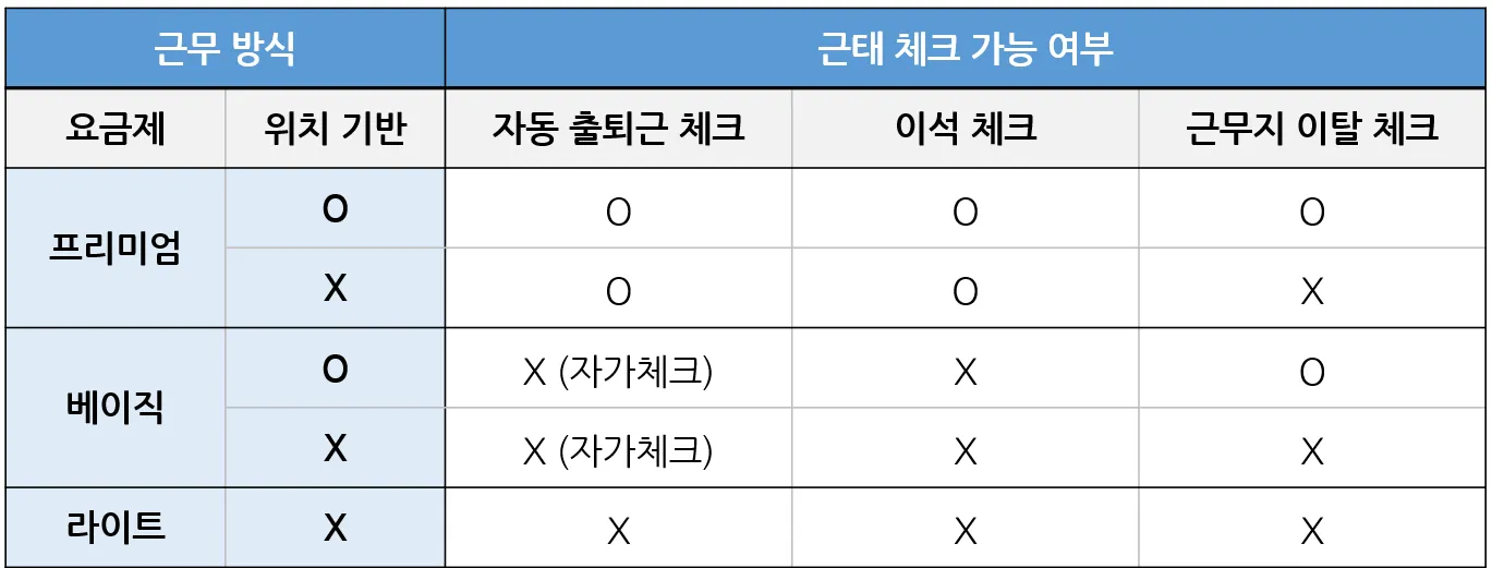 '프리미엄 + 근무지 위치 지정' 관리 방식일 때 근무지 이탈 시 적용 근무제에 따라 다음과 같이 처리 됩니다.