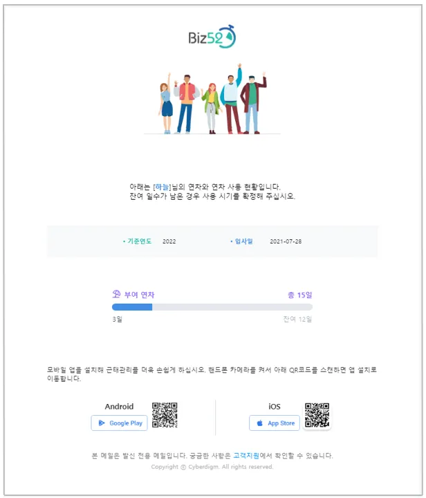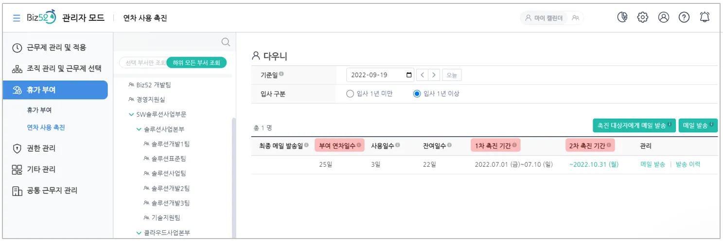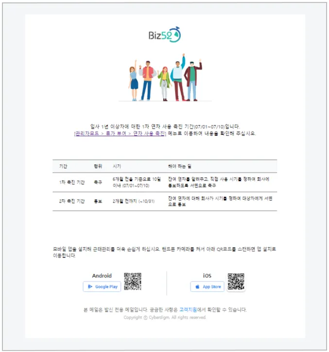 입사 1년 이상자의 연차 촉진 메일 발송 기간이 되면, 비즈52에서 시스템 관리자/근무 관리자에게 안내 메일이 발송됩니다.
