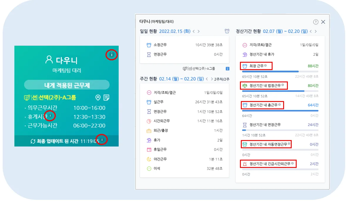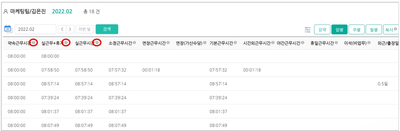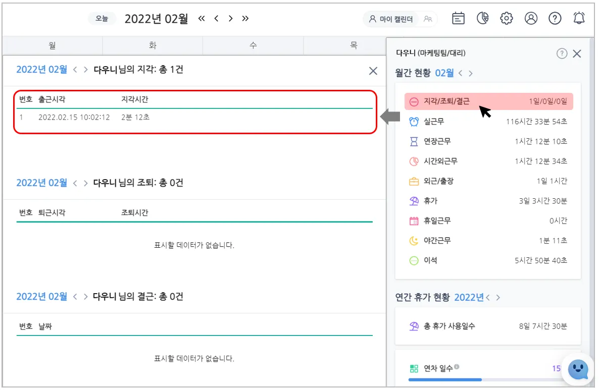 각 근무 현황 항목에 대한 자세한 날짜와 현황을 확인하고 싶다면? 해당 항목을 클릭 시 날짜와 시간을 상세하게 확인할 수 있습니다!