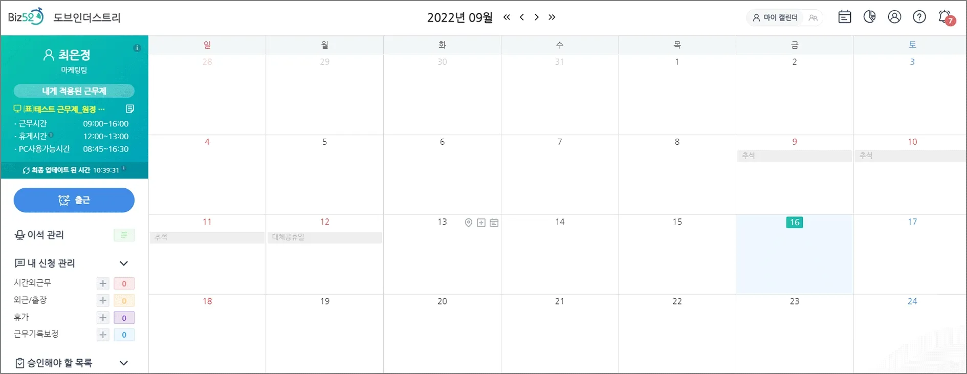 지난 업데이트에 이어 입사 1년 이상자 대상으로 연차 사용 촉진 기능이 추가되었으며, 웹 캘린더 사용자 근무현황에 휴가/지각/조퇴/결근 항목이 추가되었습니다.