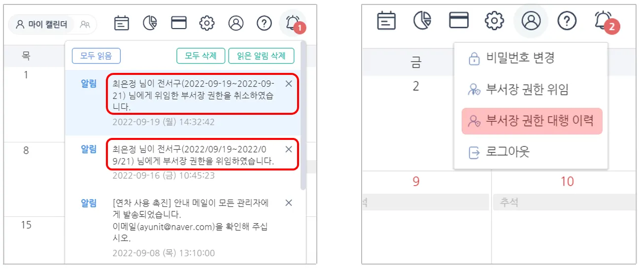 부서장 위임 내력 알림 및 권한 대행 이력 확인