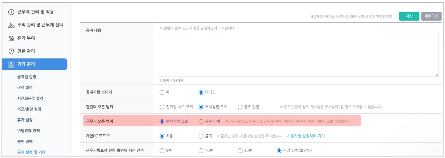 관리자 모드 > 기타 관리 > 공지 설정 및 기타 의 근무지 오픈 범위  에서 전직원 서로 조회 기능이 삭제됩니다.