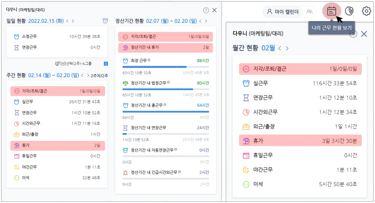 마이캘린더에서 나의 근무 현황 보기를 선택하면  주간 현황/정산기간 현황/월간 현황에 따라 기간별 근무현황을 세세하게 확인할 수 있습니다.