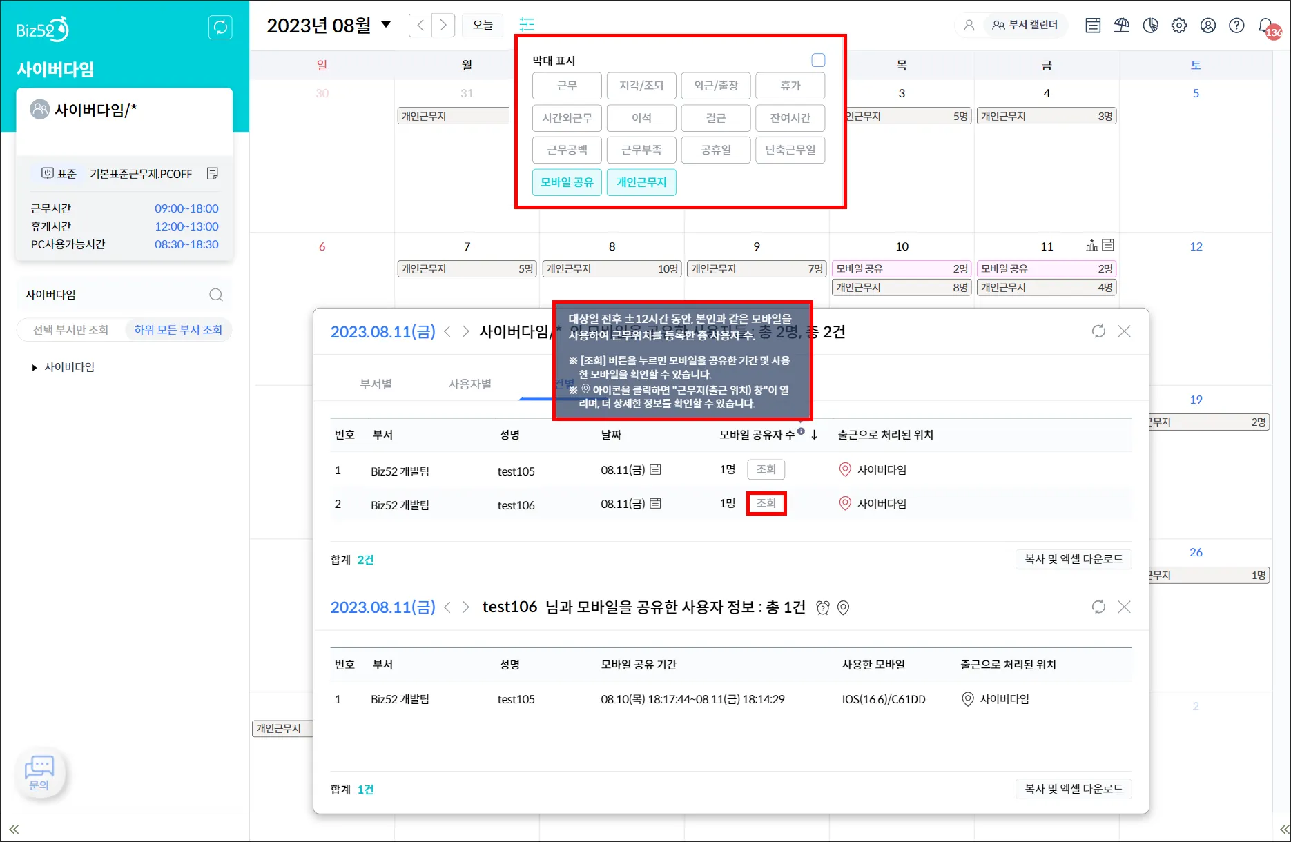 ※ 캘린더의 ‘필터’에서 ‘모바일 공유’와 ‘개인근무지’를 체크해야 볼 수 있다는 점, 잊지 마세요!