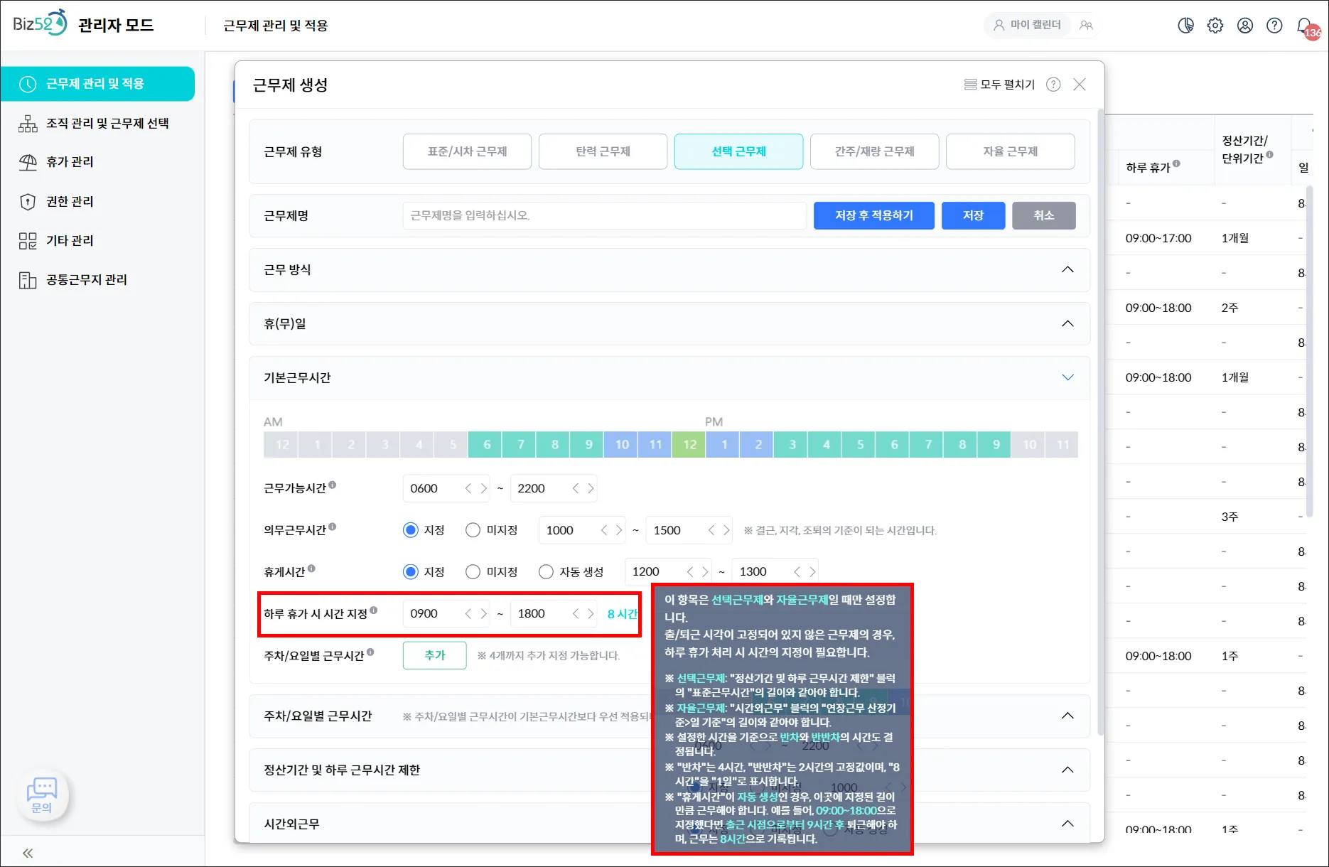 2. "선택근무제/자율근무제" 생성 시 "하루 휴가 시 시간 지정" 옵션 추가