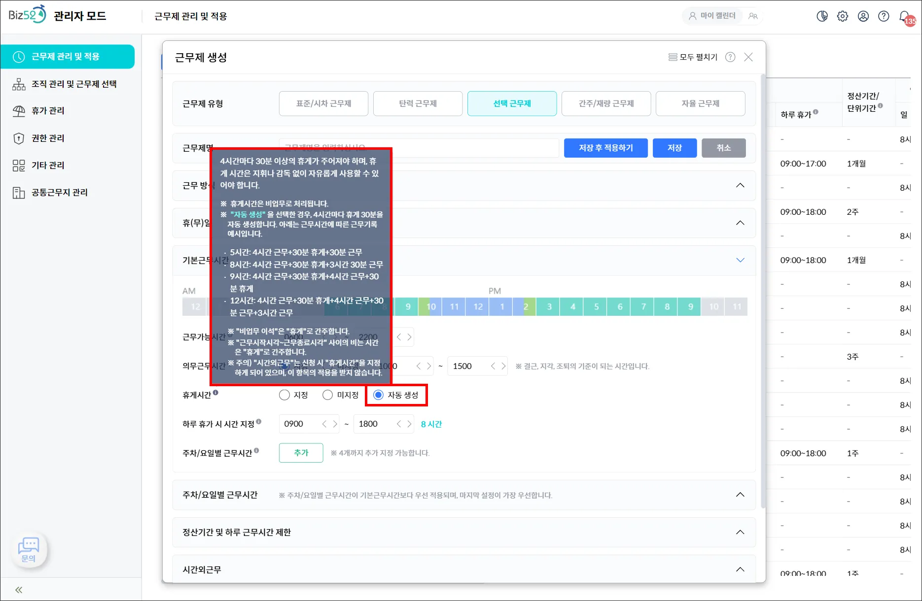 1. "근무제"에 "휴게시간 자동 생성" 옵션 추가
