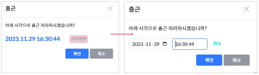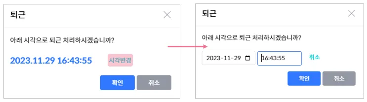 출근 후 바로 회의에 참여하는 등의 사유로 버튼 클릭이 늦어졌을 때, 시각변경을 통해 실제 출/퇴근 시간을 입력할 수 있습니다.