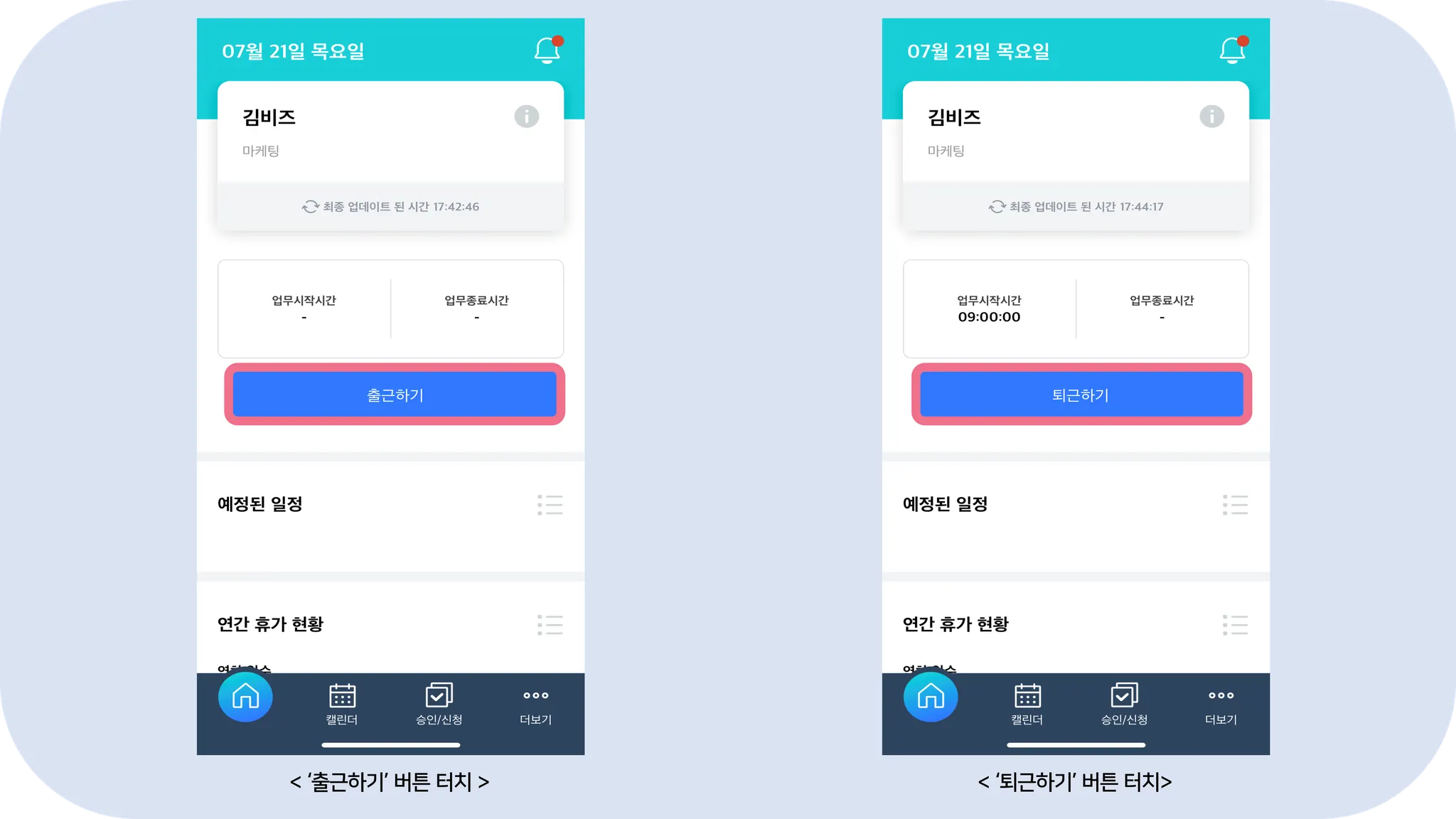 근무관리 서비스 중 베이직을 사용하고 계신다면 웹 뿐만 아니라 모바일 앱에서도 출퇴근을 기록할 수 있습니다. 모바일 앱에 로그인 하신 뒤 출근하기 , 퇴근하기 버튼을 눌러 웹과 동일하게 출퇴근 시간을 기록 할 수 있습니다.