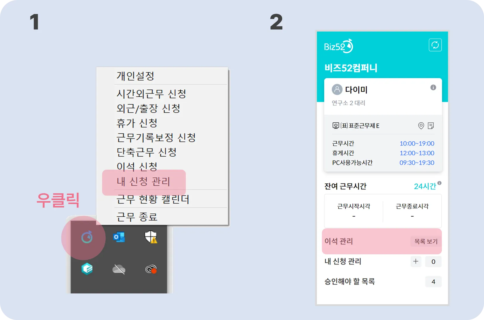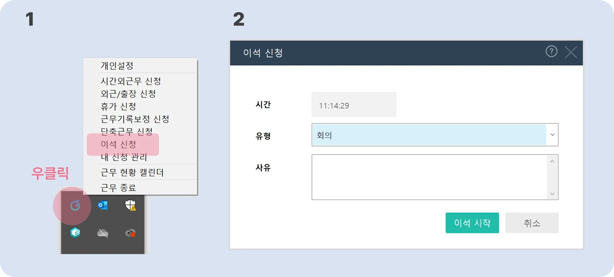 1) 에이전트 트레이아이콘 메뉴 > 내 신청 관리 > 이석 탭으로 이동