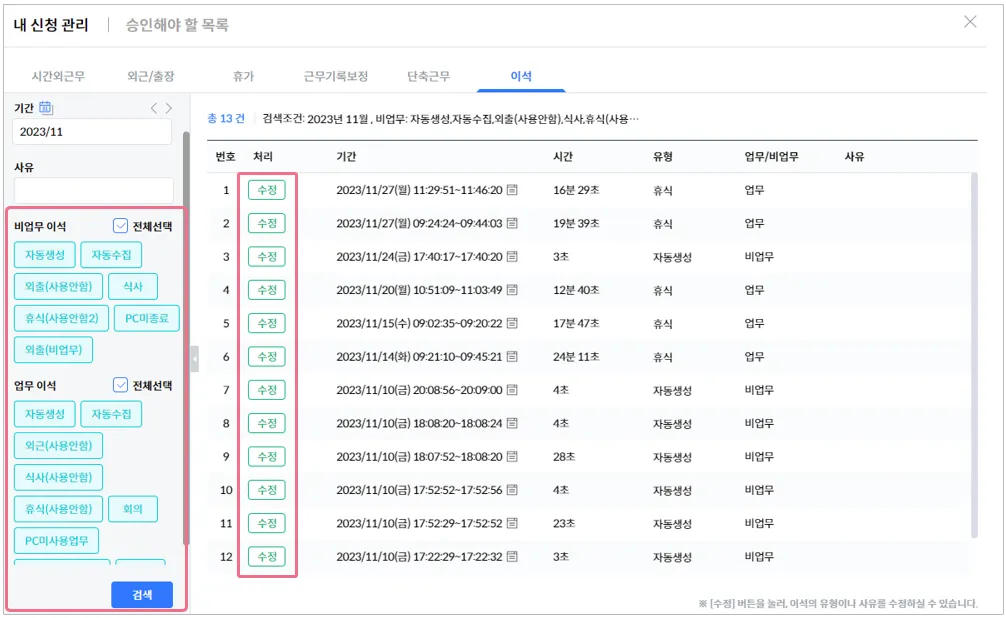 이 곳에서 1) 이석 유형 선택과 업무 이석 내역를 조회할 수 있고 2) 수정 버튼을 클릭해 기록된 이석 유형과 사유를 수정할 수 있습니다.