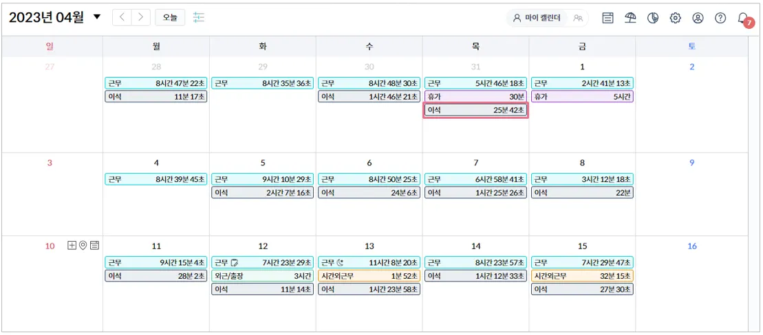 이석 신청 후에 자리를 비울 경우, 나중에 자리에 돌아오면 측정된 시간만큼, 미리 설정한 이석 유형대로 기록됩니다. 예정된 회의로 인해 자리를 비울 경우 유용하게 사용할 수 있죠!