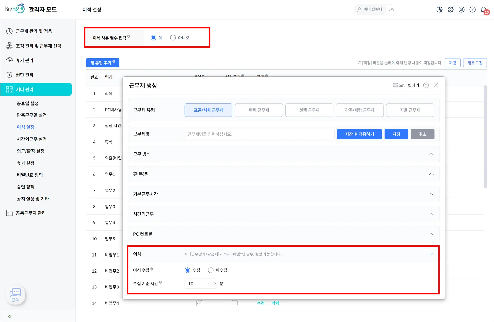 5. [관리자모드>근무제 관리 및 적용] “근무제 생성” 창의 "이석” 입력 방식 개선