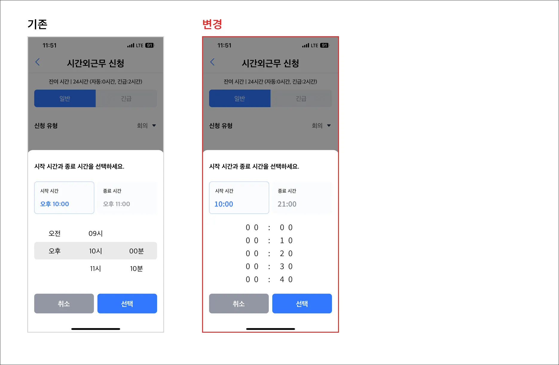 모바일에서 신청 시 시간이 오전/오후로 구분되어 있어 12시와 24시를 설정할 때 불편했다는 요구사항을 반영해,