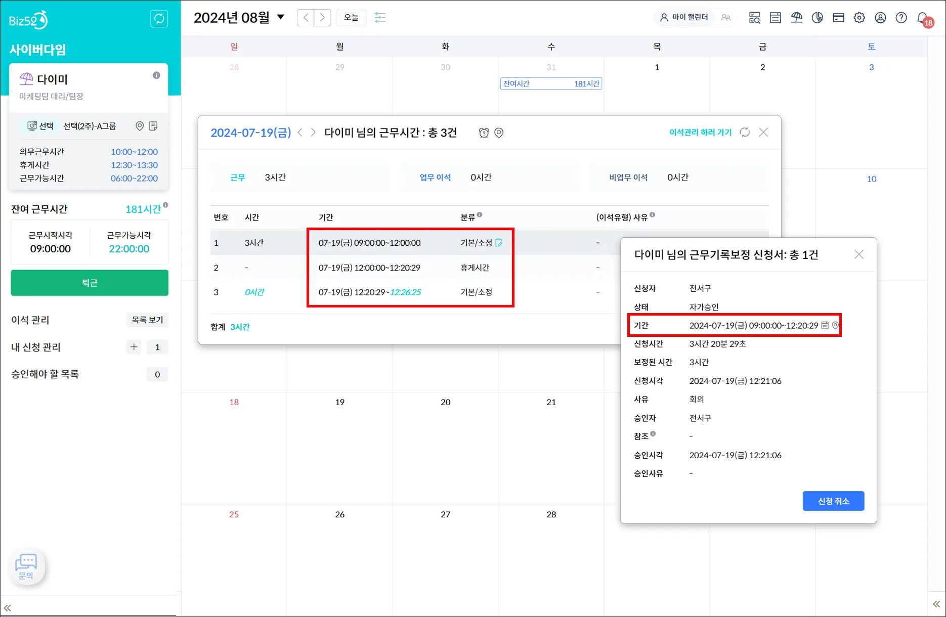 아래 화면은 “12:20:29”부터 근무 중인 상황에서 “09:00~12:30”으로 근무기록보정을 신청했을 때의 예시입니다.