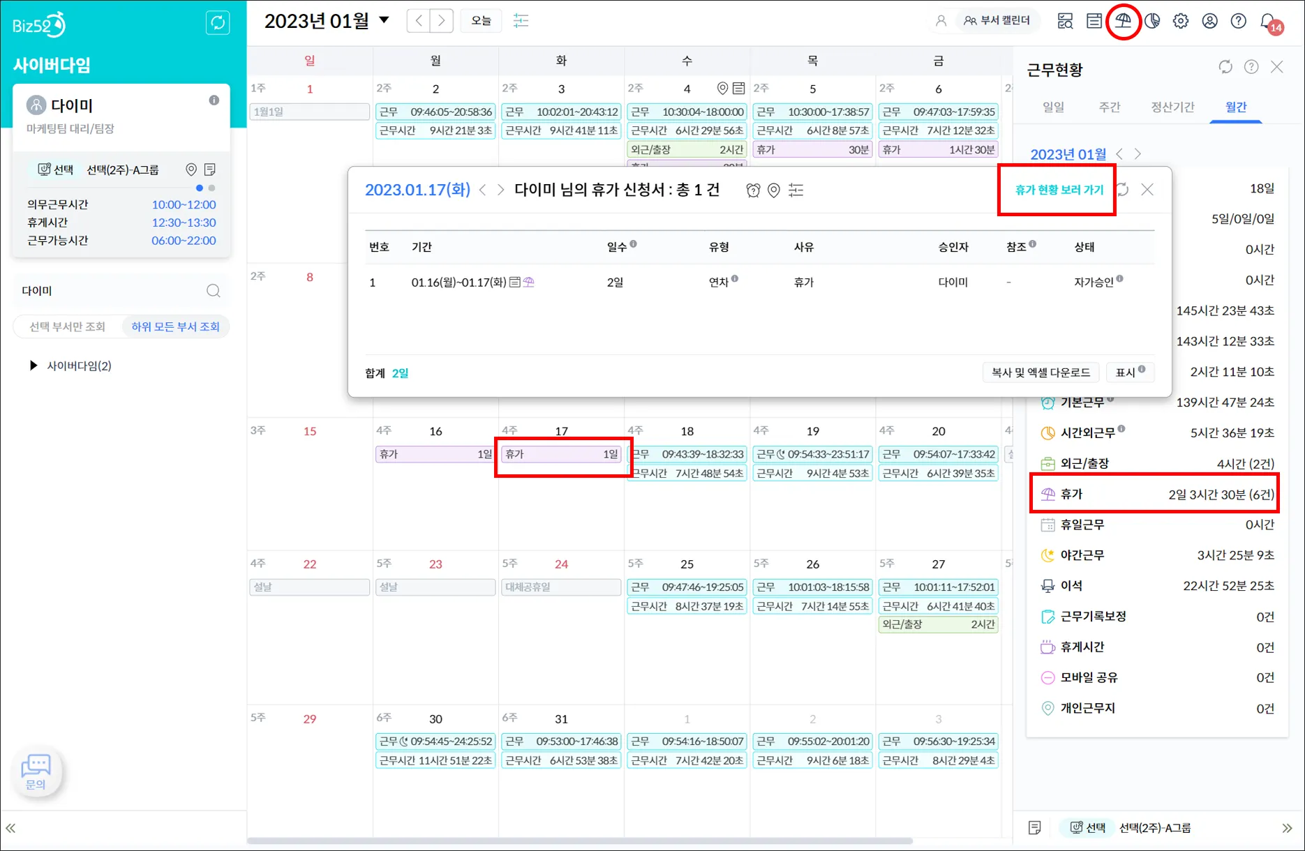 개인 캘린더에서 클릭하면 해당 사용자의 휴가 현황이, 부서 캘린더에서 클릭하면 해당 부서의 휴가 현황이 나타납니다.