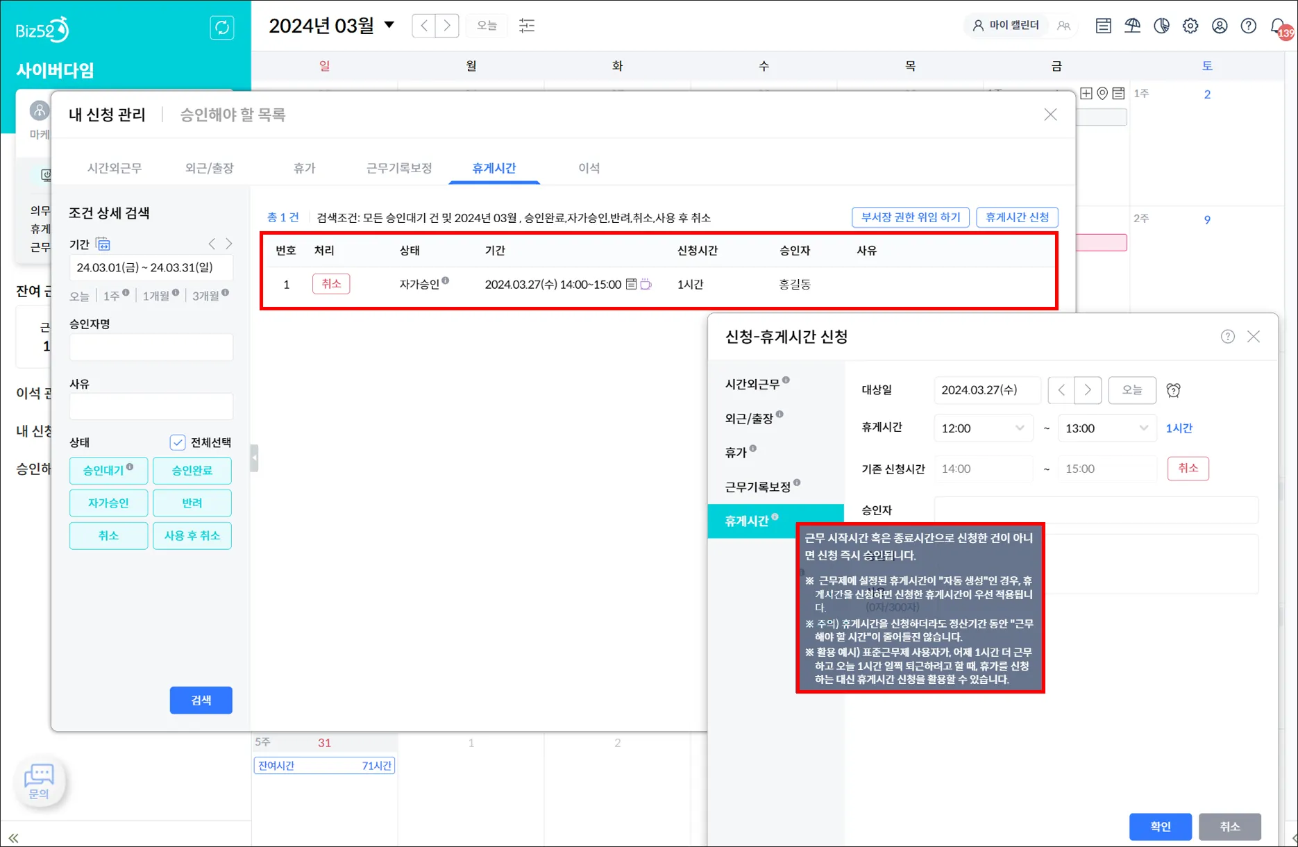 2) 신청하는 휴게시간이 ‘지각/조퇴 시간’에 해당하지 않는 경우, ‘자가승인’이 허용된 사용자가 아니더라도 ‘자가승인’으로 처리됩니다.