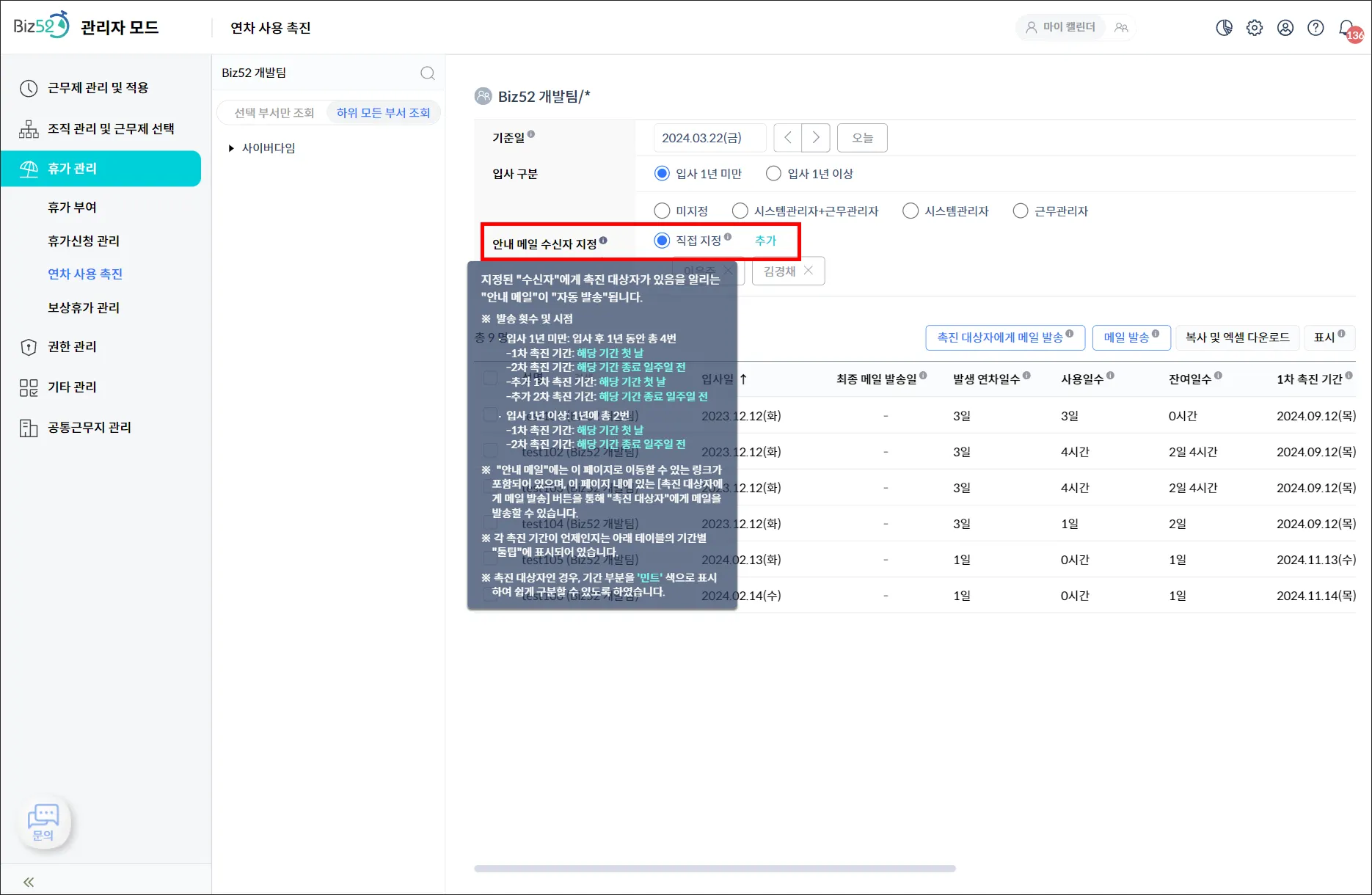 기존에는 연차 사용 촉진자가 있음을 알리는 안내 메일이 Biz52에 등록된 ‘시스템관리자’와 ‘근무관리자’ 모두에게 발송되었습니다.
